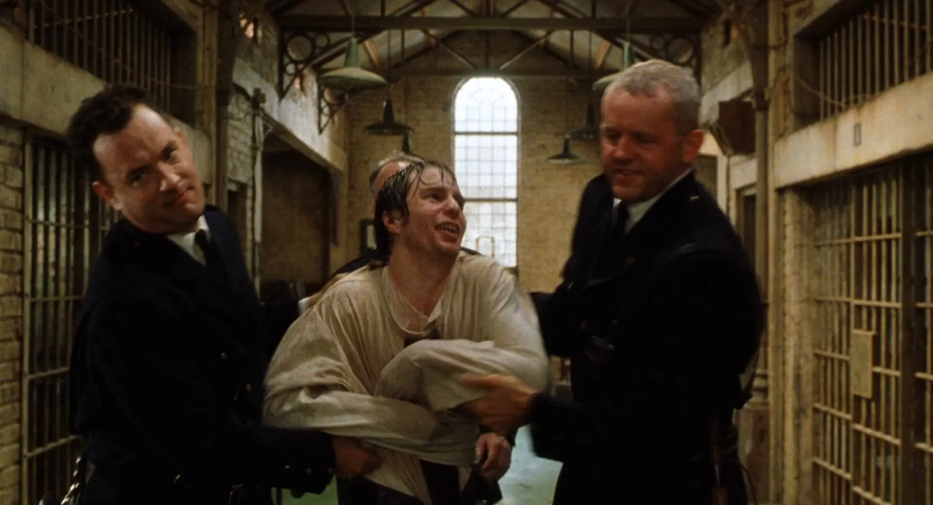 Tom Hanks as Paul Edgecomb, David Morse as Brutus "Brutal" Howell, Bonnie Hunt as Jan Edgecomb, Michael Clarke Duncan as John Coffey, James Cromwell as Warden Hal Moores, Michael Jeter as Eduard Delacroix, Graham Greene as Arlen Bitterbuck, Doug Hutchison as Percy Wetmore, Sam Rockwell as 'Wild Bill' Wharton, Barry Pepper as Dean Stanton, Jeffrey DeMunn as Harry Terwilliger, Patricia Clarkson as Melinda Moores, Harry Dean Stanton as Toot-Toot, Dabbs Greer as Old Paul Edgecomb, Eve Brent as Elaine Connelly, William Sadler as Klaus Detterick, Mack Miles as Orderly Hector, Rai Tasco as Man in Nursing Home, Paula Malcomson as Marjorie Detterick, Christopher Joel Ives as Howie Detterick, Evanne Drucker as Kathe Detterick, Bailey Drucker as Cora Detterick, Brian Libby as Sheriff McGee, Brent Briscoe as Bill Dodge, Bill McKinney as Jack Van Hay, Gary Sinise as Lawyer Burt Hammersmith, Rachel Singer as Cynthia Hammersmith, Scotty Leavenworth as Hammersmith's Son, Bill Gratton as Earl the Plumber, Dee Croxton as Woman at Del's Execution, Rebecca Klingler as Wife at Del's Execution, Gary Imhoff as Husband at Del's Execution, Van Epperson as Police Officer, David E. Browning as Reverend at Funeral, Tommy Barnes as Tower Guard (uncredited), Wes Hall as Prisoner (uncredited), Phil Hawn as Police Photographer (uncredited), Judy Herrera as Bitterbuck's Daughter (uncredited), Ted Hollis as Coffee Execution Witness (uncredited), Gower Mills as Inmate (uncredited), Garth Shaw as Inmate (uncredited), Jared Stovall as Inmate (uncredited), Todd Thompson as Prison Guard (uncredited)